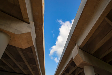 View Underneath a Large Bridge Highway on a Sunny Day with Blue Sky
