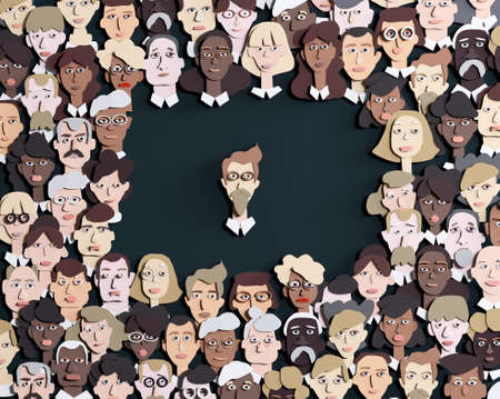Lots of people's faces made of paper. People different ages and professional backgrounds. Paper cut design 3D render