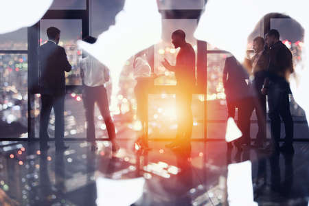 Businessmen that work together in office. Concept of teamwork and partnership. double exposure