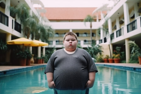 Fat boy with overweight standing near swimming pool at hotel resort. Problem of obesity during summer holidays. Created with Generative AI