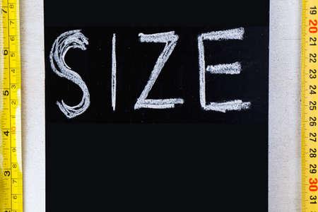 Tape measure, centimeters and millimeters on the yellow ruler and size word text on the back board.