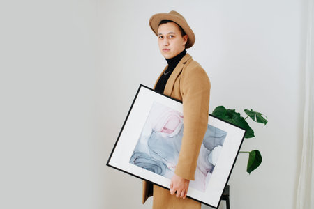 Stylish young man in a beige suit and classical hat posing with abstract painting under his arm. He is standing sideways, looking at the camera. Indoors, in front of the white wall.