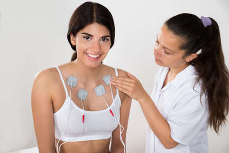 Therapist Placing Electrodes On Happy Woman's Chest
