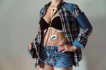 Woman wearing holter monitor device for daily monitoring of an electrocardiogram. Diagnostic of heart diseases. healthcare. Electrodes attached to body and bag with portable computer.Close-up.