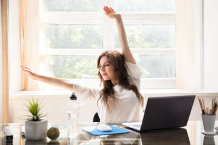 Happy Young Businesswoman Stretching Her Arms In Office
