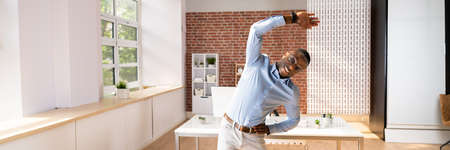 Smiling Young Businessman Doing Stretching Exercise In Office