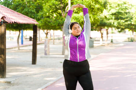 Warm up exercises. Latin obese woman listening to music with headphones and stretching her body before a workout outdoors