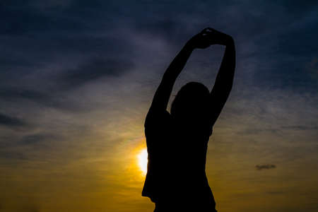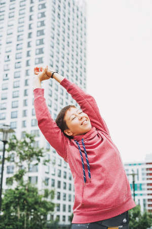 Happy determined female athlete, sportswoman enjoys morning cardio workout, stretches her arms, raising them up, exercises at sunrise. Fitness, health, body care, sport and active lifestyle concept