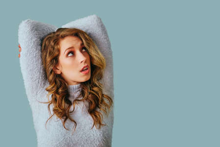 portrait of a beautiful young woman with long curly hair wearing sweater looking up at copy space