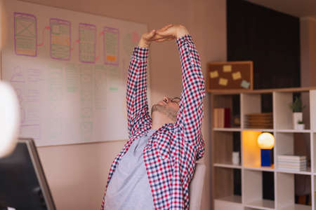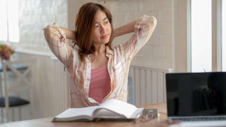 Caucasian female student working from home late at night stretching after long study session