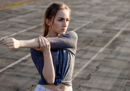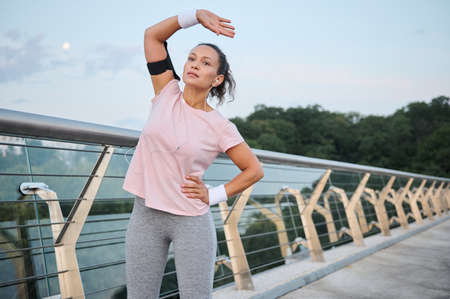 Beautiful woman athlete doing arm stretches while exercising on the bridge and enjoying an early morning workout outdoors. Sports, fitness, outdoor workout, running and healthy lifestyle concept.