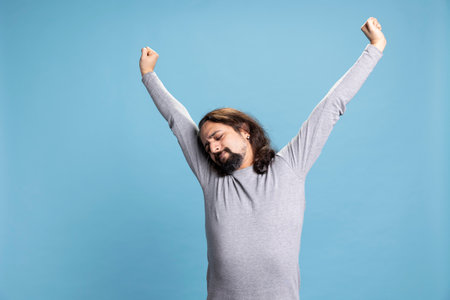 Relaxed casual person stretching his muscles for recreation on camera, being cozy and in comfort against blue background. Male model with an athletic fit physique feels confident with himself.