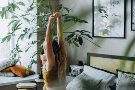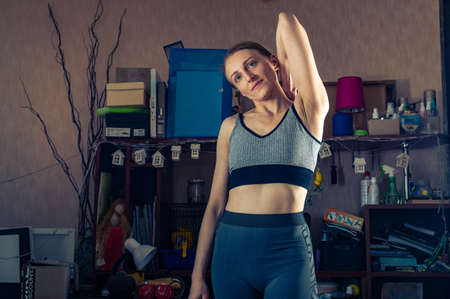 Flexible Caucasian girl does fitness in the early morning, before work. Sport lifestyle, wellness stretching