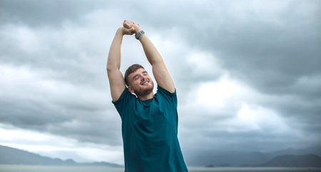happy handsome free guy, young calm relaxed carefree man traveler with open raised hands enjoy sea, ocean view, person feeling good, breath deep deeply fresh air. Freedom, travel, happiness concept