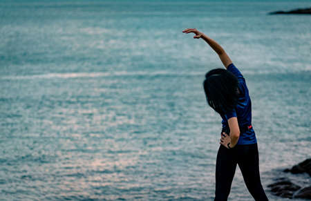 Asian woman workout in the morning at stone beach with beautiful sunrise sky. Fit woman runner stretching body before running. Cardio exercise for healthy lifestyle. Active girl workout alone.