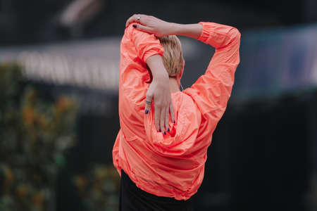 Young woman training on stadium in summer. Sportswoman, stretching, warming up before exercise outside. Healthy lifestyle.