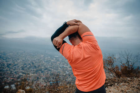 Unrecognized man wearing sports clothes in the coast stretching after working out.