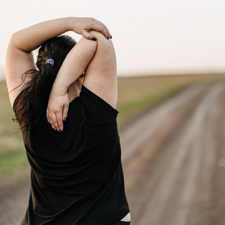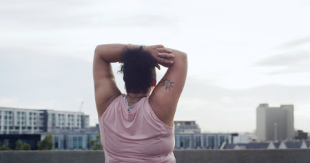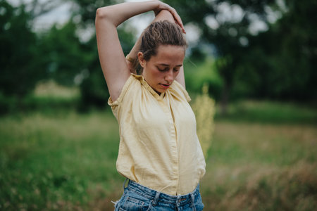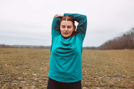 Plus-size woman stretching hands relaxing outdoors
