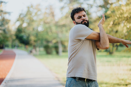 Man stretching in park for outdoor fitness and relaxation