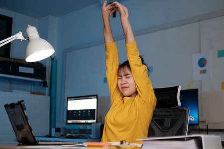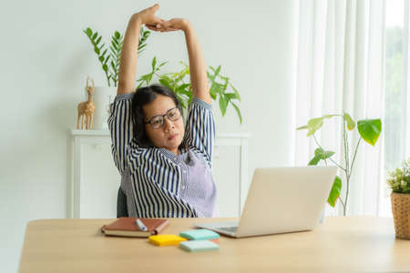Concept work at home : Fat Asian businesswoman wears glasses. Asian woman feels tired, stretching arms from sitting with a laptop computer for a long time.