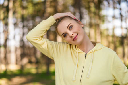 Attractive sporty woman in sportswear trains outdoors. Warm up or stretching, healthy lifestyle.