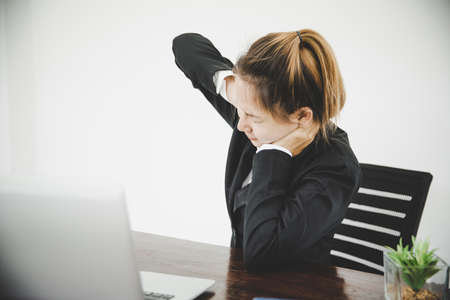 Young asian woman is sitting at work and has pain in her neck while she is sitting in the office working