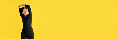 Beautiful woman in black sportive bodysuit training, stretching before workout against yellow studio background.