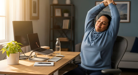 A woman takes a refreshing break from work, stretching her arms above her head while sitting in an ergonomic chair at her home office desk. This scene promotes wellness and illustrates the importance of taking breaks while working from home.