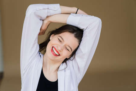 Smiling young girl standing at the kitchen in the morning, stretching hands