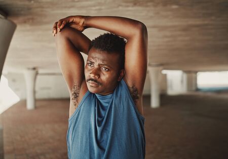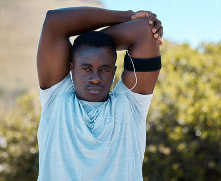 Fit african american young man stretching his arms and shoulders to warmup before a run outside. Serious handsome athlete stretching his body before exercising as he listens to music on his earphones