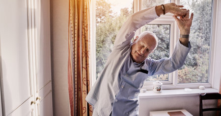 Elderly man stretching arms in home bedroom, relax and body health in the morning. Senior person exercise, flexible warm up and wellness, fitness or training workout in retirement, apartment or house