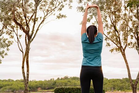 Back view of a woman stretching her arms and legs before her early morning exercise at a local lake park with morning sunrise sky, mountains and lake background, room for copy space