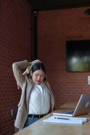 Asia woman raised arm after sedentary with computer work in incorrect posture at desk, gesturing, Employees do light exercises at home to relieve fatigue from work, muscles, Office syndrome concept