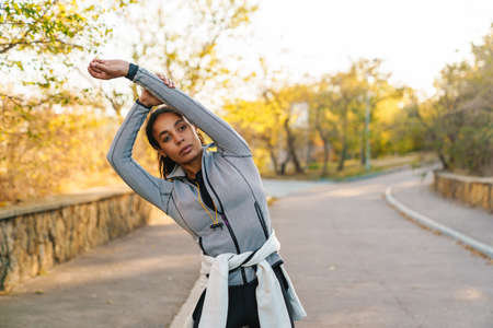 Portrait of an african american young man stretching his hands before running at outdoors looking away