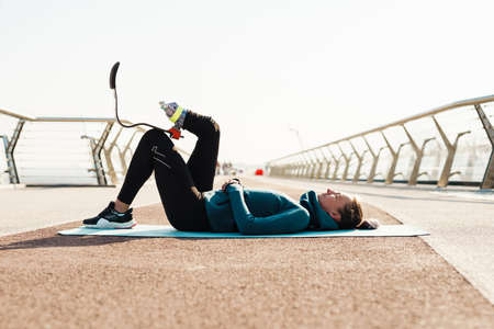 Young sportswoman with prosthesis doing exercise while working out on city bridge