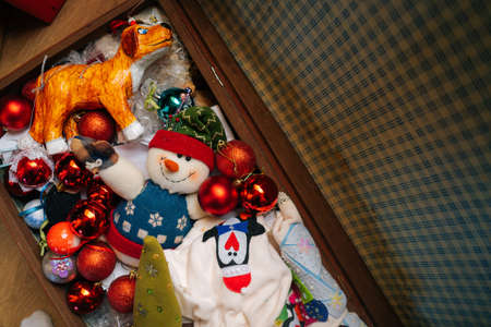 High-angle view of various festive Christmas toys and colorful balls lying in old family suitcase box, selective focus. Preparing for xmas, new year and winter holidays, happy mood.