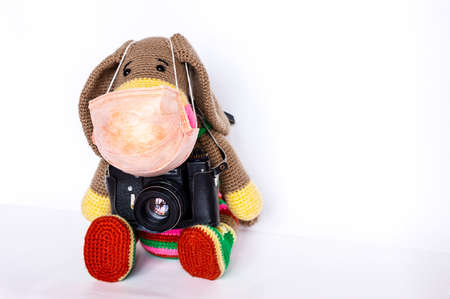 Amigurumi doll handmade donkey sitting with a camera.