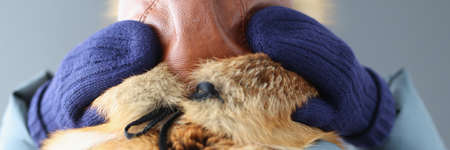 Woman standing with her back and holding fur hat with her hands