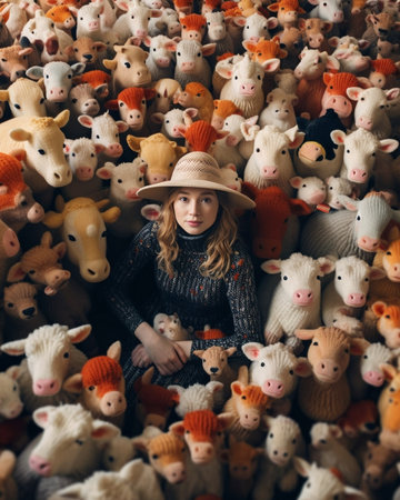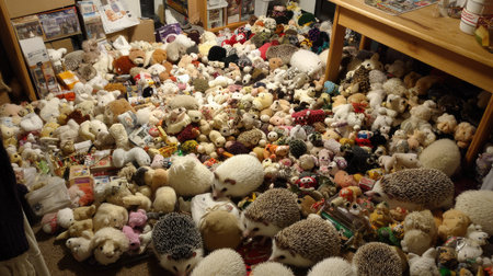 A delightful scene of a cozy room filled with an extensive assortment of plush toys, soft hedgehogs, and colorful stuffed animals creating a joyful atmosphere.