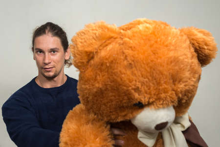 his favorite toy. toy shop concept. brutal handsome man with moustache. mature guy playing. happy birthday gift. happiness and joy. bearded hipster hugging fluffy teddy bear toy