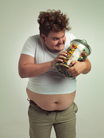 an overweight man talking to his jar of candy.