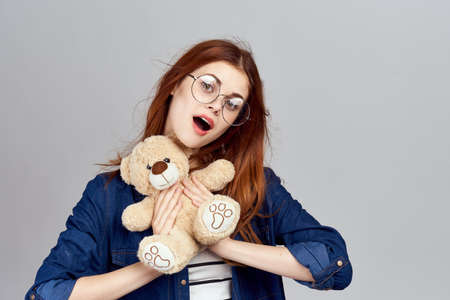cheerful woman with teddy bear fashion posing holiday