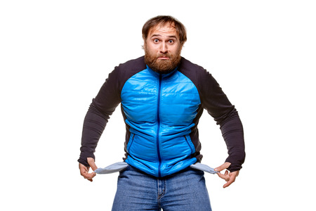 stoutman wearing jeans and blue sweater, shows empty pockets, looking at the camera, isolated on a white background