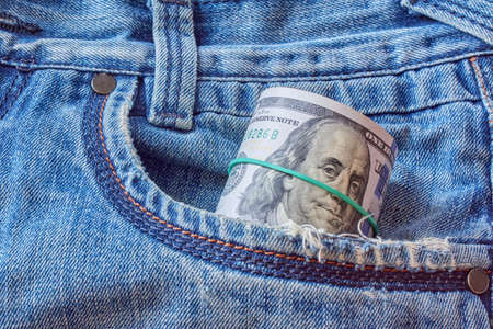 Roll of dollar banknote in worn jeans pocket. Saving money concept
