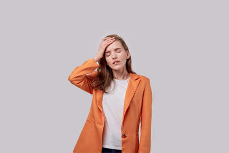 Portrait of pretty girl and dark long hair wearing orange t shirt having tired expression holding her hand on head. Young attractive girl with headache isolated on gray background