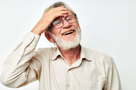 elderly man with a gray beard in a shirt and glasses light background