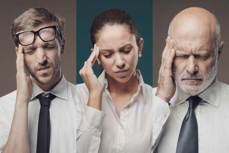 Business people suffering with headache, they are touching their temples, photo collage