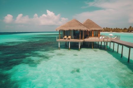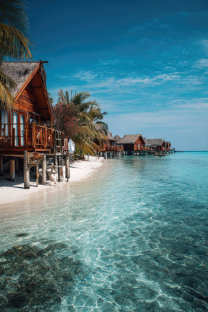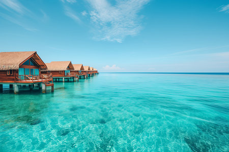 This image showcases wooden bungalows situated over crystal-clear turquoise water on a sunny day. The composition highlights the structures against a background of a bright blue sky. The style suggests a calm and relaxed environment. It may be suitable for travel, vacation, or hospitality-related content.