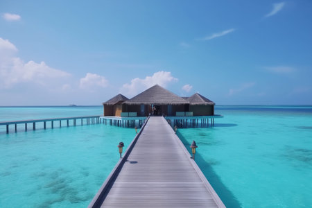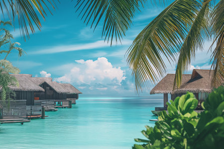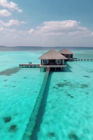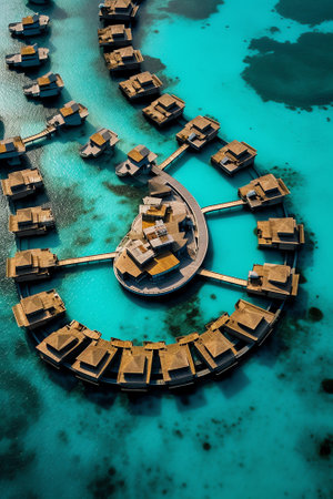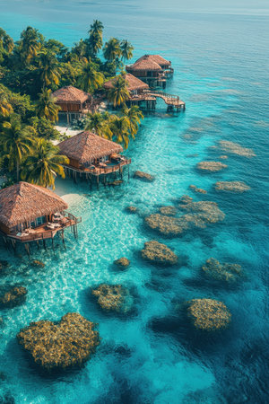 An overhead perspective showcases overwater bungalows connected by wooden walkways, set against a vibrant turquoise ocean. The scene features a clear blue sky, lush green vegetation, and sandy beaches. Suitable for travel advertising, vacation themes, or illustrating paradise concepts, this image offers a sense of tranquility.