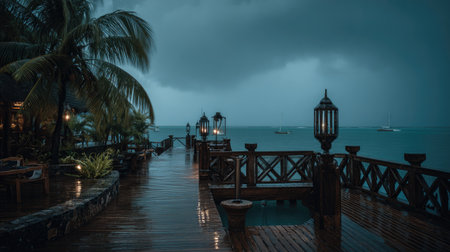 A wooden dock extends into a vast ocean under a moody, overcast sky. The image features architectural elements, including decorative lanterns, set against a backdrop of dark clouds and sea. The scene evokes a sense of tranquility and awe. Suitable for use in travel, design, and environmental publications.